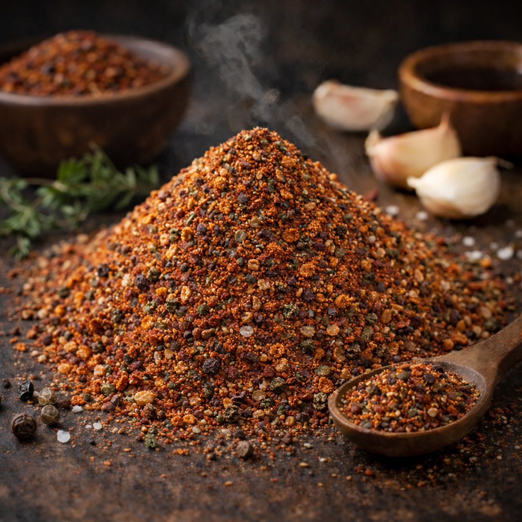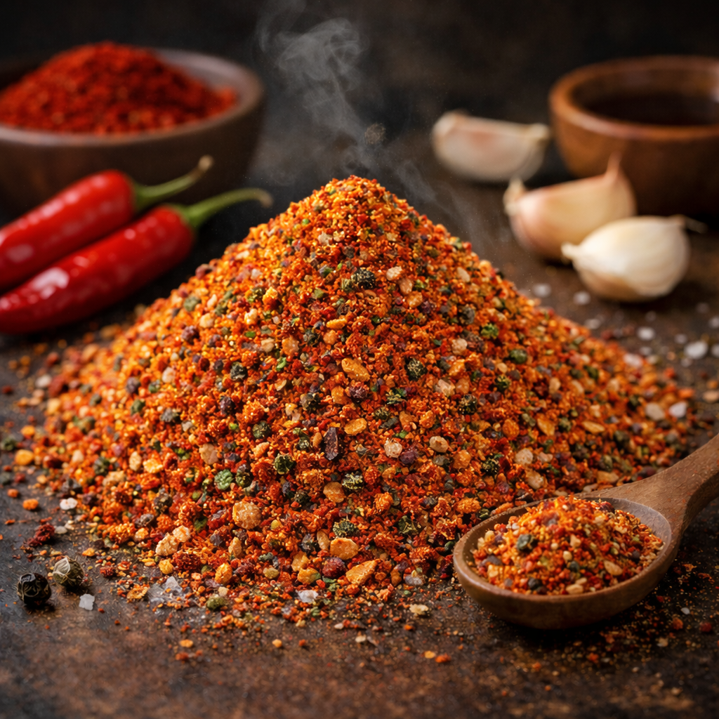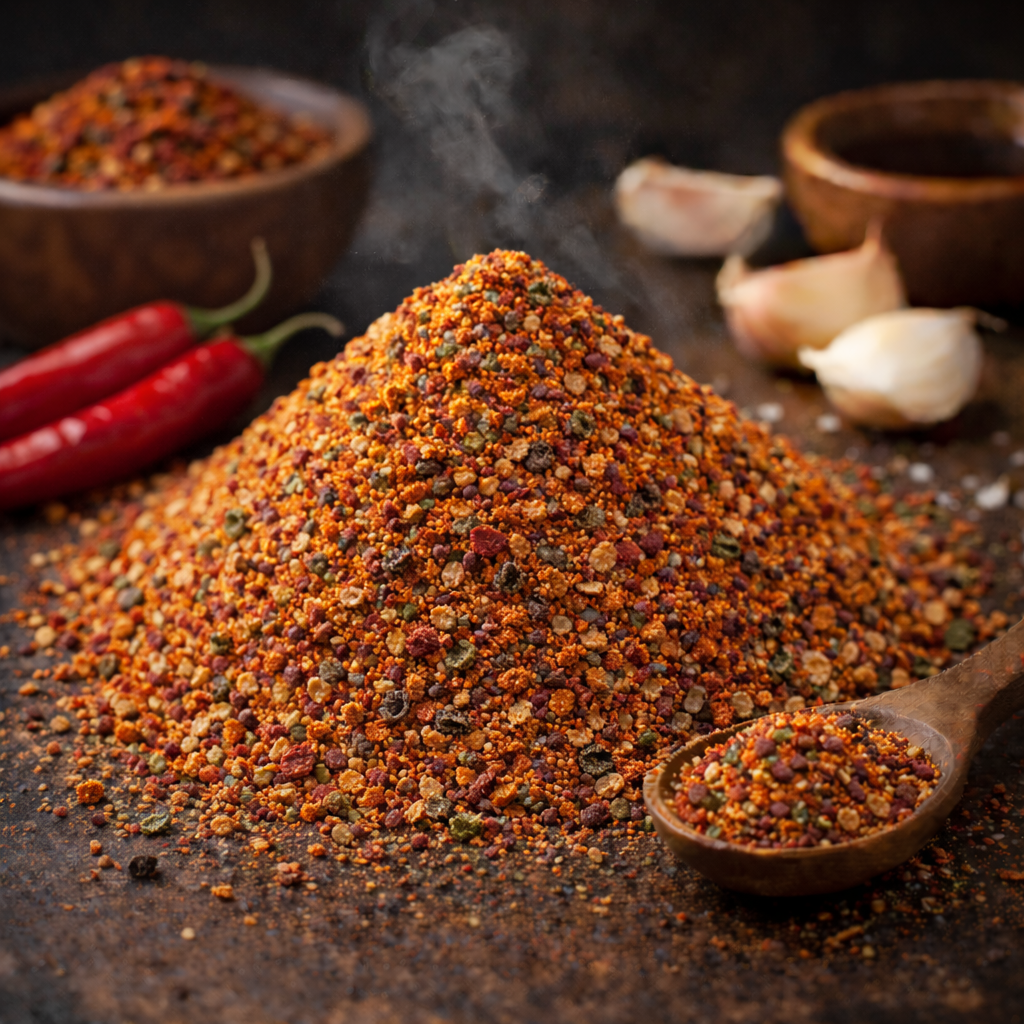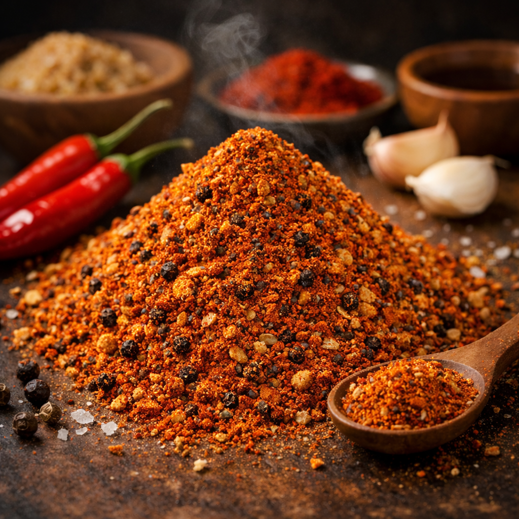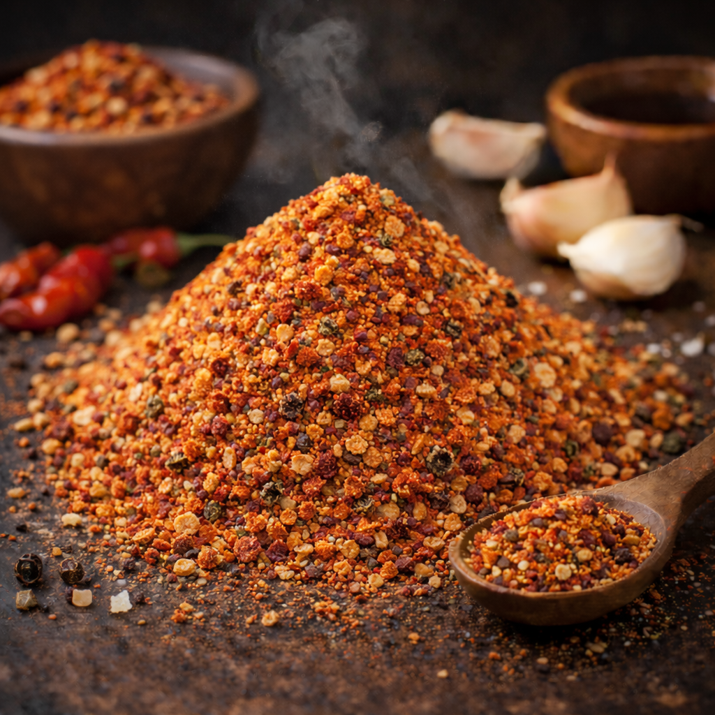 Garlic Powder, Smoked Paprika Powder, Chilli Flakes, Burnt Sugar Powder, Black Pepper, Ground Black