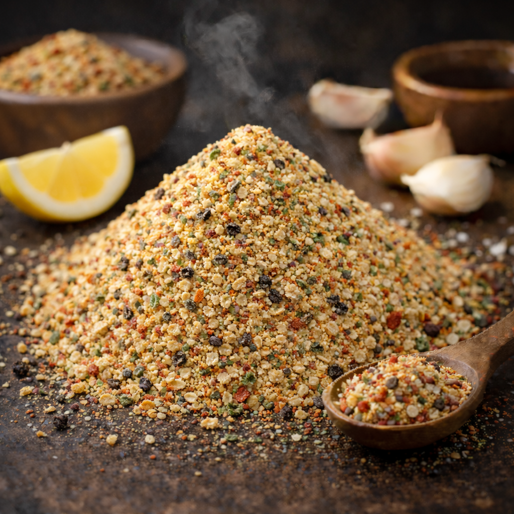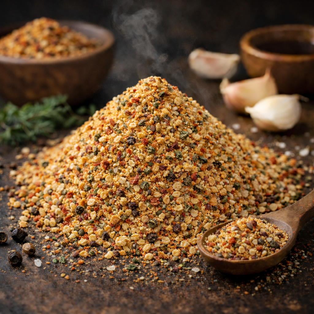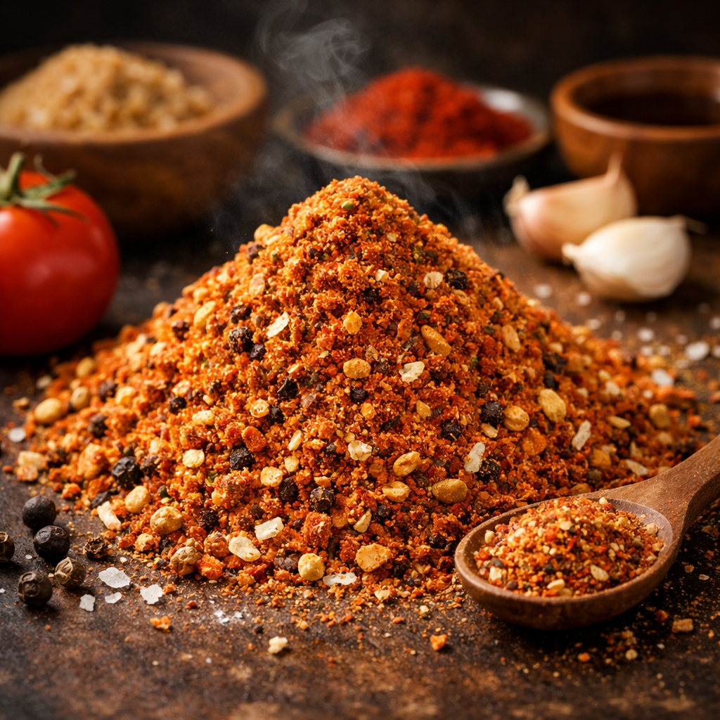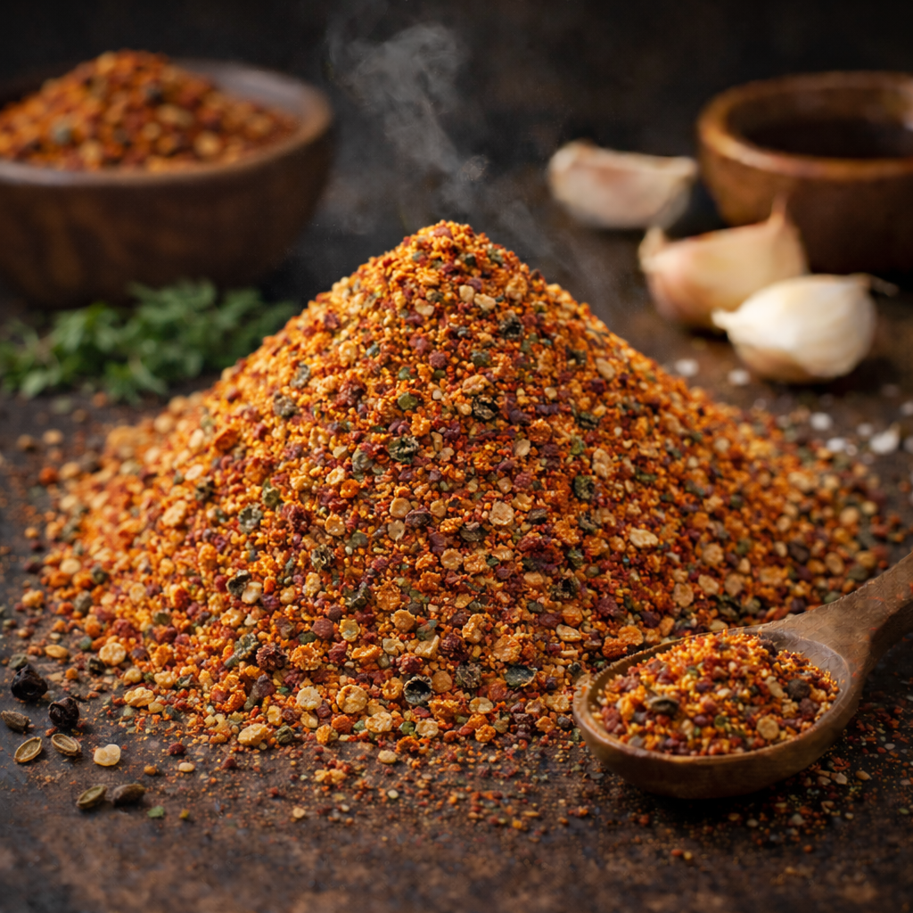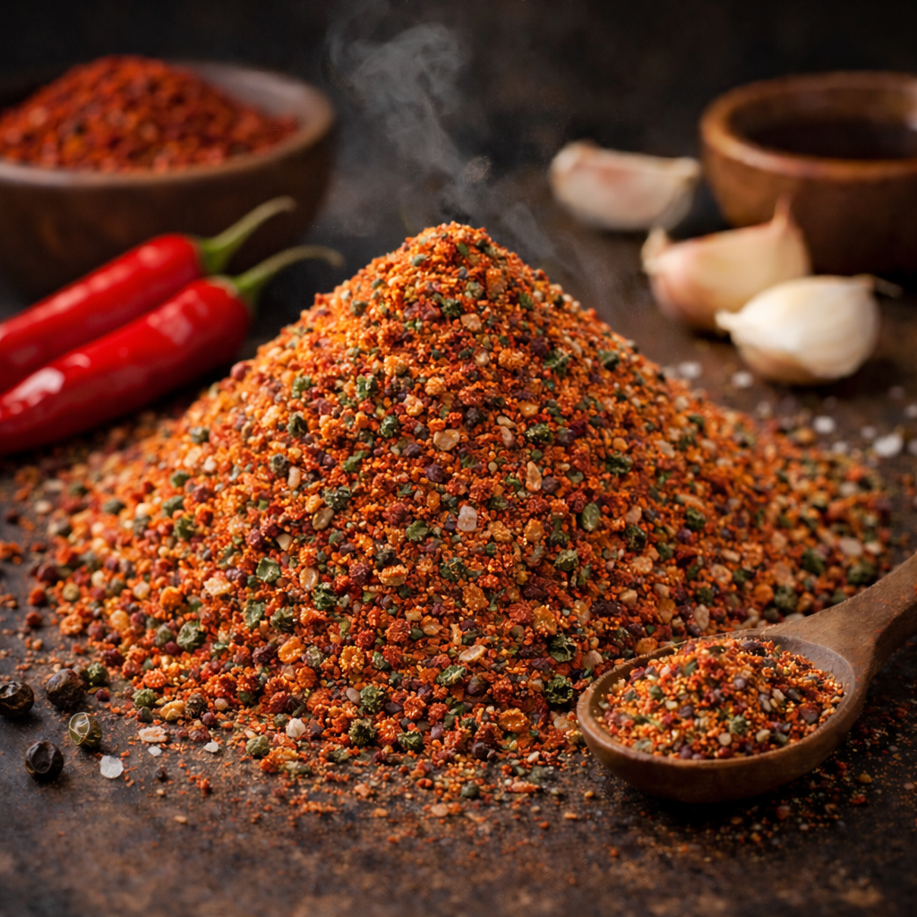 Garlic Powder, Smoked Paprika Powder, Chilli Flakes, Burnt Sugar Powder, Black Pepper, Ground Black
