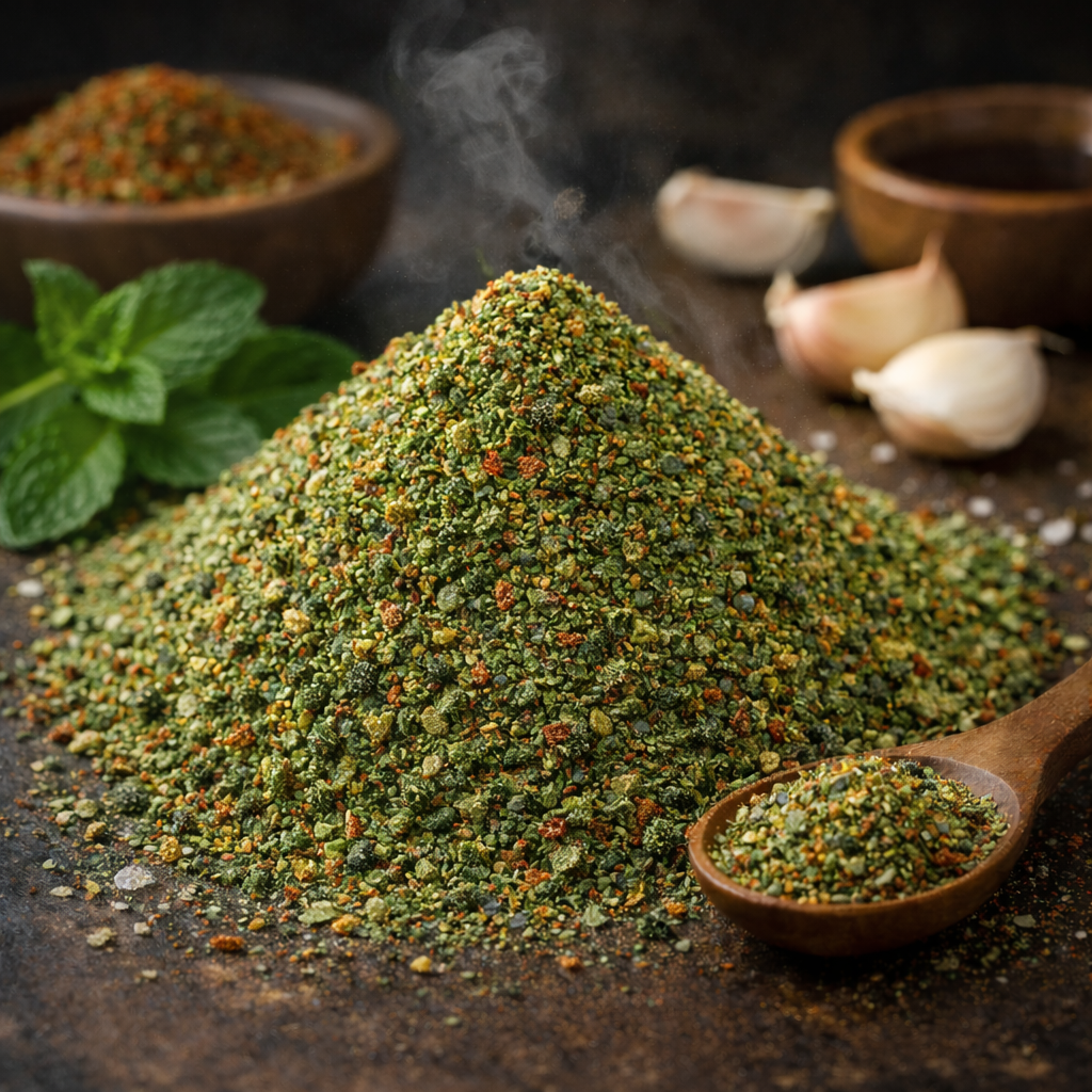 Garlic Powder, Crushed Chillies, Rice Flour, Chilli Powder, Ground Cumin, Dried Rubbed Mint, Natural