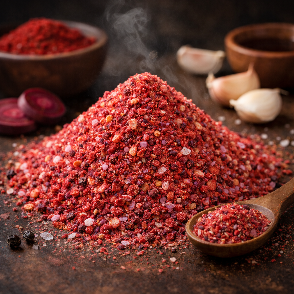 Ingredients: sugar, Maltodextrin, Salt, Starch, Colours (Beetroot Red, Carmine, Plain Caramel, Paprika Extract and Natural Rosemary Flavouring), Spices (Star Anise, Cinnamon, Ginger),